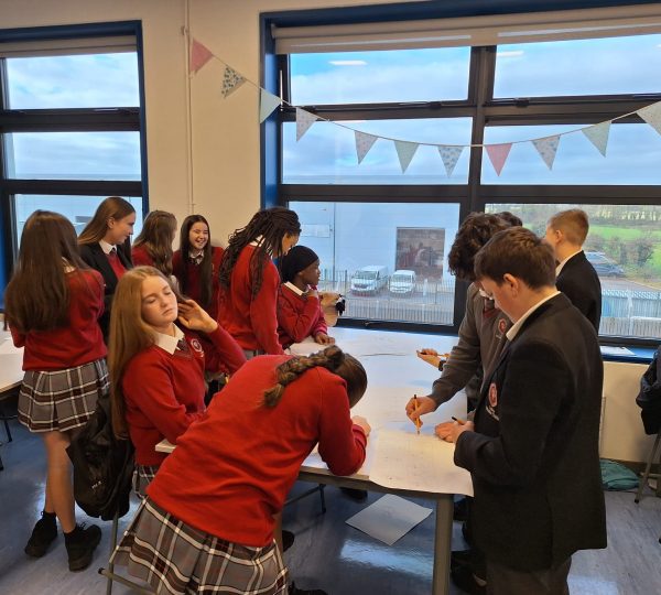 Taking on the cartoon challenge at the workshop at Coláiste Baile Chláir